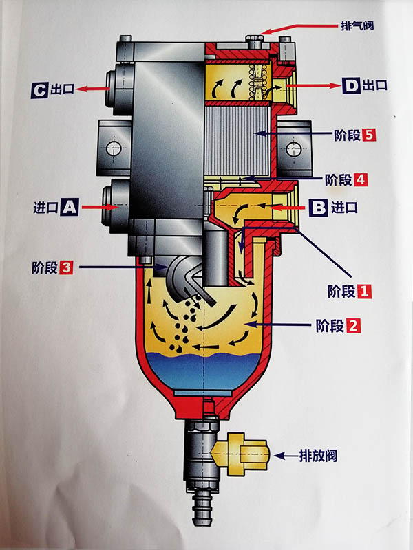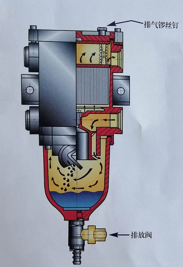 因?qū)蚬艿廓M窄使流速增加,但當(dāng)?shù)竭_(dá)濾芯下面,導(dǎo)流空間擴(kuò)大導(dǎo)致燃油流速下降,此時(shí)剩余非常微小的微粒及水點(diǎn)在導(dǎo)向管聚積 , 并在凝聚效應(yīng)下,最后掉進(jìn)杯低,可從排放閥門排出.