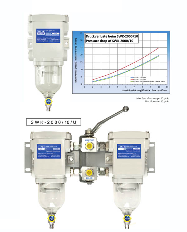 SEPAR(世柏)SWK-2000燃油過濾器,能將柴油的水份及微粒分離, SEPAR(世柏)SWK-2000過濾器是經(jīng)過5個(gè)過濾階段,所以能保證100%解決燃油含水及污染的問題.